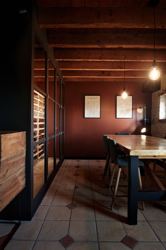 Cette pièce peut être privatisée pour des réunions de travail professionnelles. Création d’une cave à vin sur-mesure, en cohérence avec la verrière aussi conçue dans la salle restaurant. Une mise en peinture des murs couleur lie de vin affirme l’ambiance. Une table existante a été restaurée et surélevée à hauteur de bar pour accueillir les convives.
