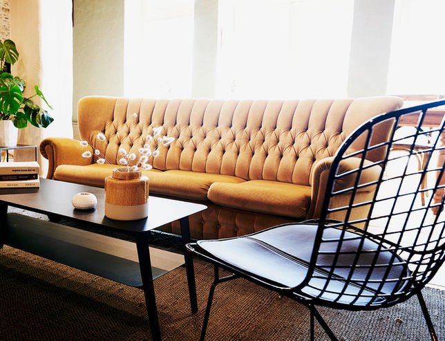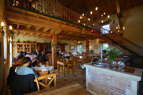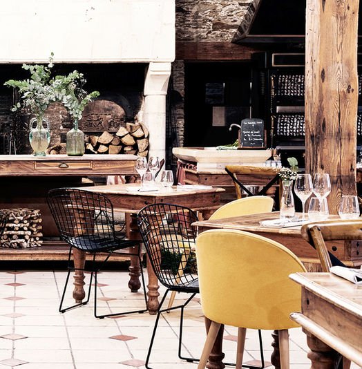 En cohérence avec la philosophie de cette institution, nous avons maximisé le réemploi et le recyclage pour ce projet. Ainsi la majorité du mobilier a été conservée et en partie remise au goût du jour. Un canapé, quelques chaises et autres accessoires de décoration ont été chinés en brocante ou d’occasion et nous avons créé une nouvelle ambiance lumineuse à l’aide de suspensions originales, notamment avec une échelle qui se trouvait dans la grange. D’autres éléments de décoration ont été ajoutés et les murs repeints dans des teintes plus actuelles afin d’apporter de la modernité à cette auberge traditionnelle. Canapé, quelques chaises et autres accessoires de décoration ont été chiné en brocante.