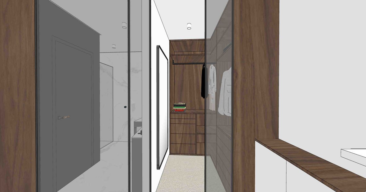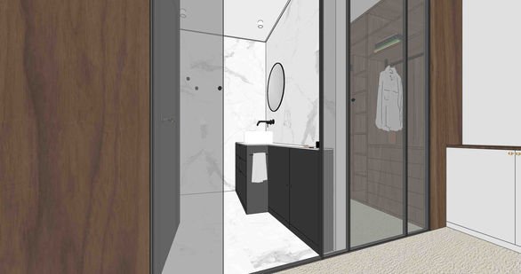 Des espaces séparés certes, mais qui peuvent être ouverts ou fermés à votre convenance : à la fois fonctionnelle et architecturale, une baie vitrée en verre fumé offre une belle profondeur visuelle et une touche architecturale à la pièce. Des rideaux d’agrément permettent de feutrer l’atmosphère et de palier à la transparence en cas de nécessité. Entre vintage et contemporain, l’utilisation de matériaux nobles comme le noyer, une moquette en laine épaisse, le verre fumé ou le marbre, donnent à cette suite un esprit chic, chaleureux, sobre et atemporel. Digne des prestations d’une suite hotelière luxueuse.