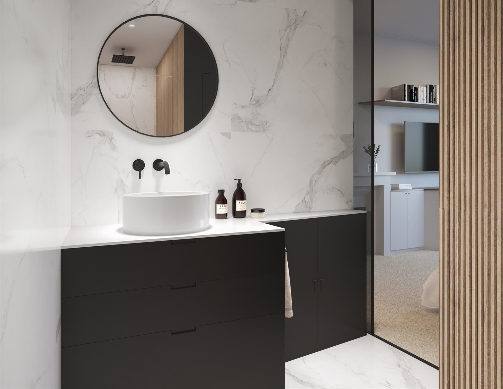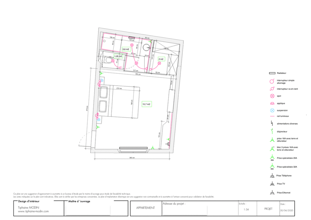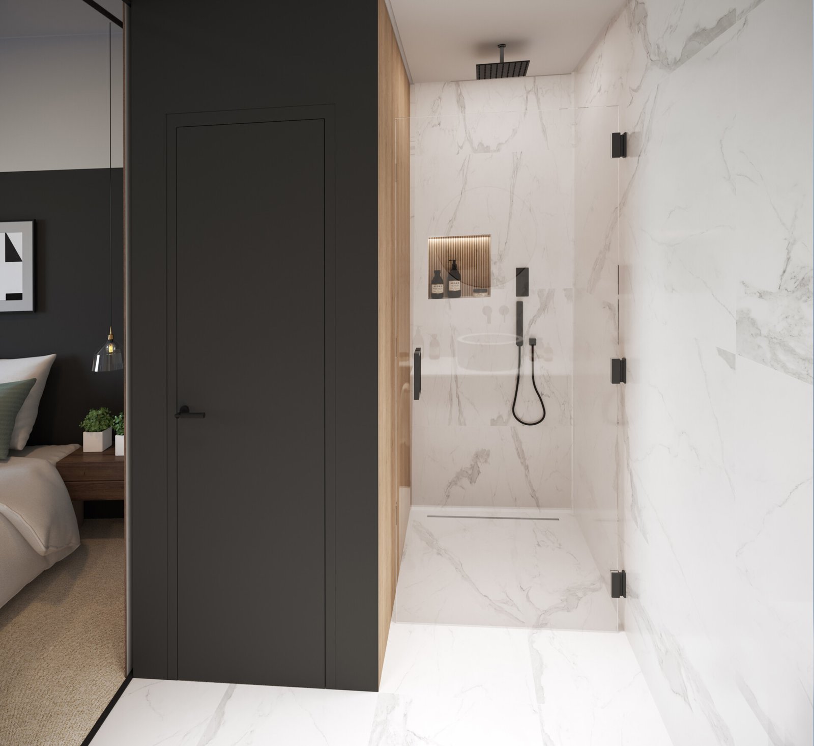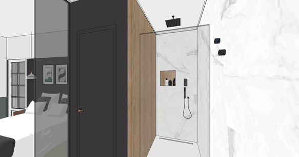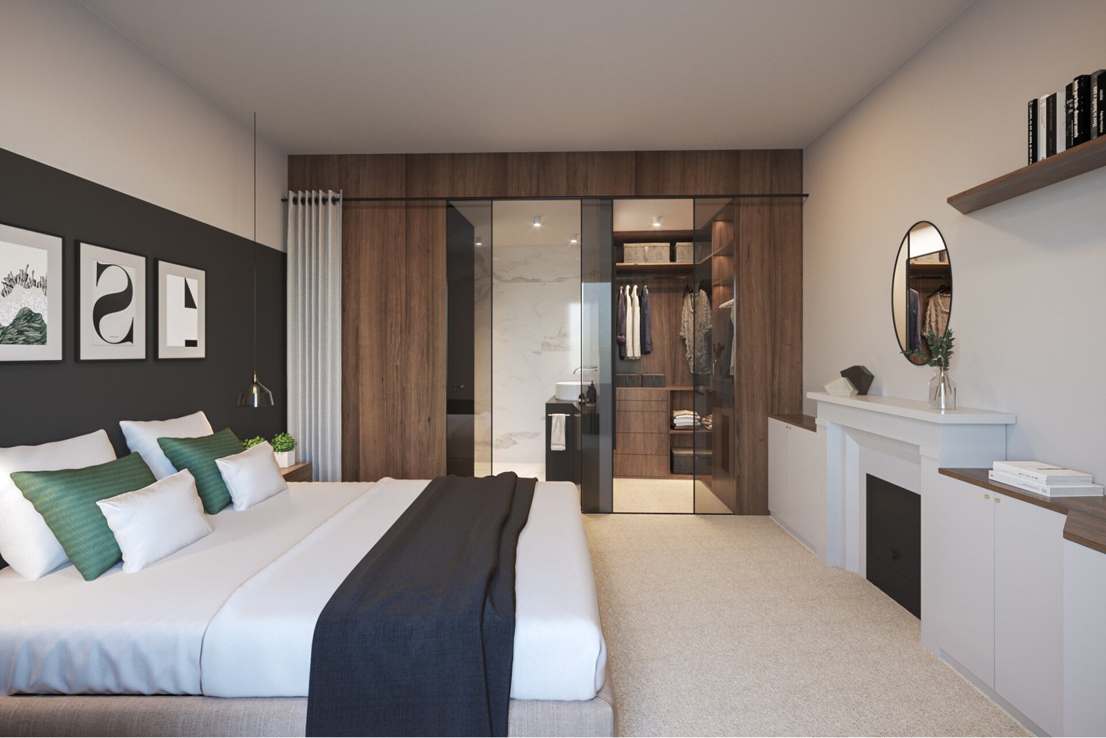 Une chambre qui allie à la fois confort, fonctionnalité et élégance. Une belle surface de chambre a été créée, avec des espaces propres pour chacune des autres fonctions : une salle de bain, des WC séparés, un dressing séparé.