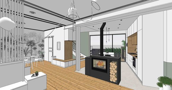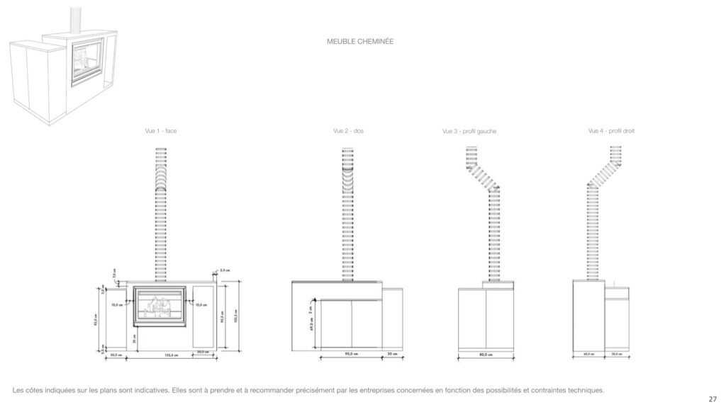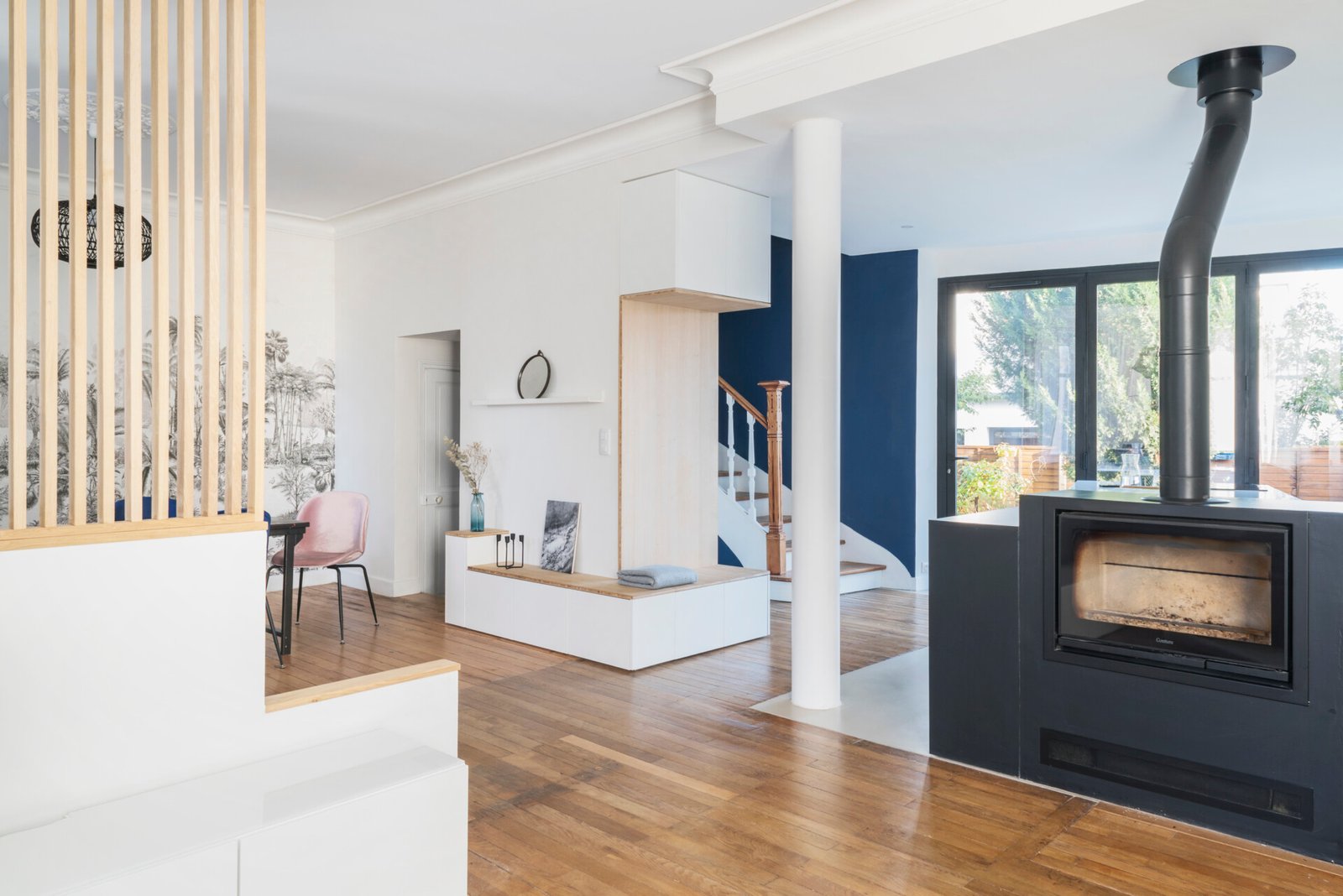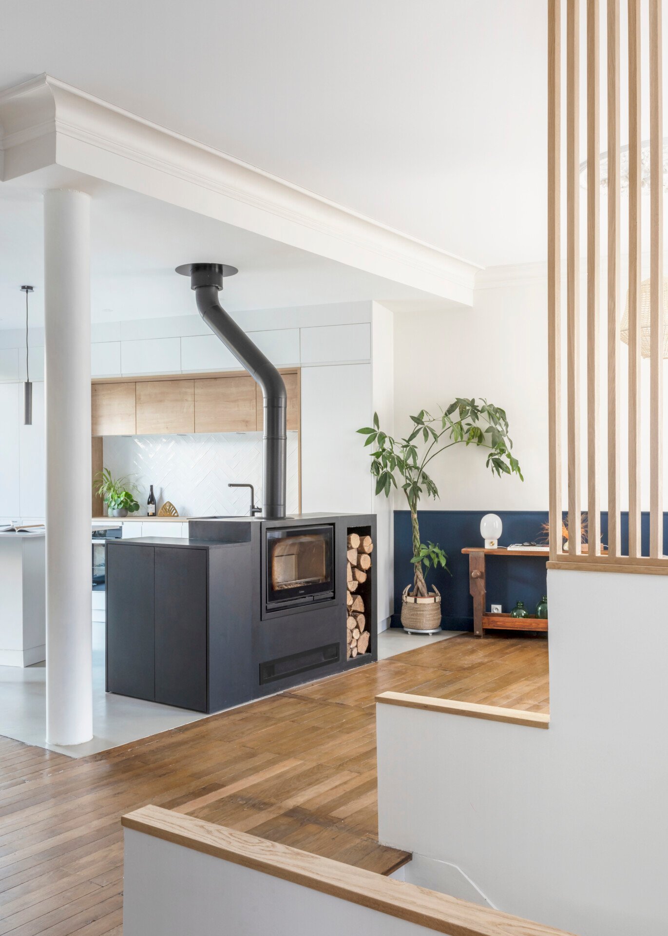 L’emplacement de la cheminée devait être conservé après démolition du mur. Nous avons donc créé un module central et affirmé entre la cuisine et le salon : insert côté salon, et rangements côté cuisine (création d’un plan de travail avec alimentations électriques pour masquer les petits électroménagers comme le grille pain, bouilloire etc). Ce module central intègre aussi une bibliothèque côté salle à manger.