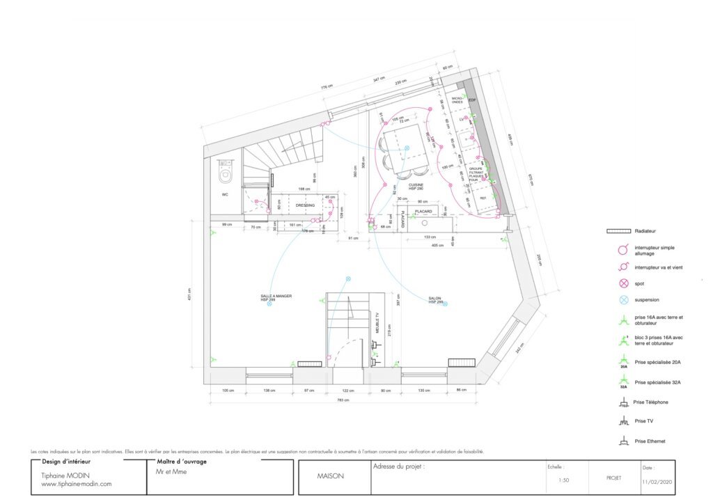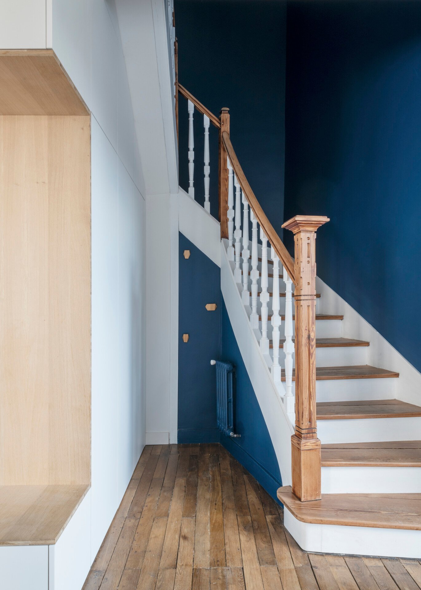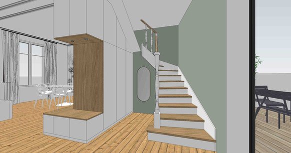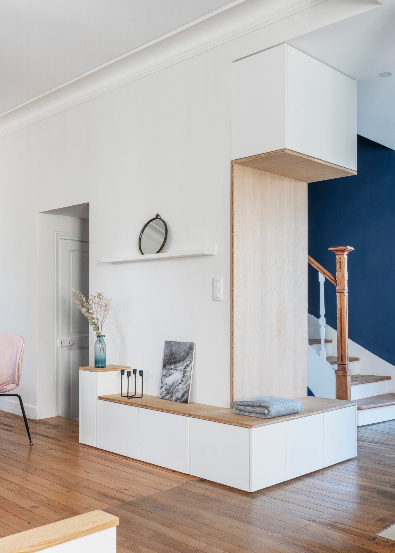 Modification de la circulation : l’accès aux WC et à la cave a été condamné dans la cage d’escalier et recréé côté salon. Nous avons ainsi pu créer un module de rangement d’entrée pour manteaux, chaussures et accessoires.